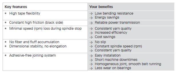 Special features: Abrasion resistant, Adhesive-free joint, Antistatic, Constant coefficient of friction, Dimensionally stable, Energy saving, Fibre fly accumulation prevention, High acceleration, High reliability, Low elasticity, Uniform yarn quality