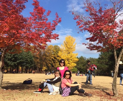 Chúng tôi thật may mắn được trải nghiệm mùa thu vàng đẹp đến ngỡ ngàng ở xứ sở Kim chi. Những mảng lá vàng lá đỏ đan xen nhau trên đảo Nami cùng thảm lá vàng rụng dưới chân làm cho phong cảnh trở nên vô cùng quyến rũ. Trong không khí se lạnh, bầu trời trong xanh cùng những con đường rợp màu đỏ của lá phong, màu vàng của lá ngân hạnh khiến chúng tôi cứ ngỡ mình như đang lạc vào cõi thơ.